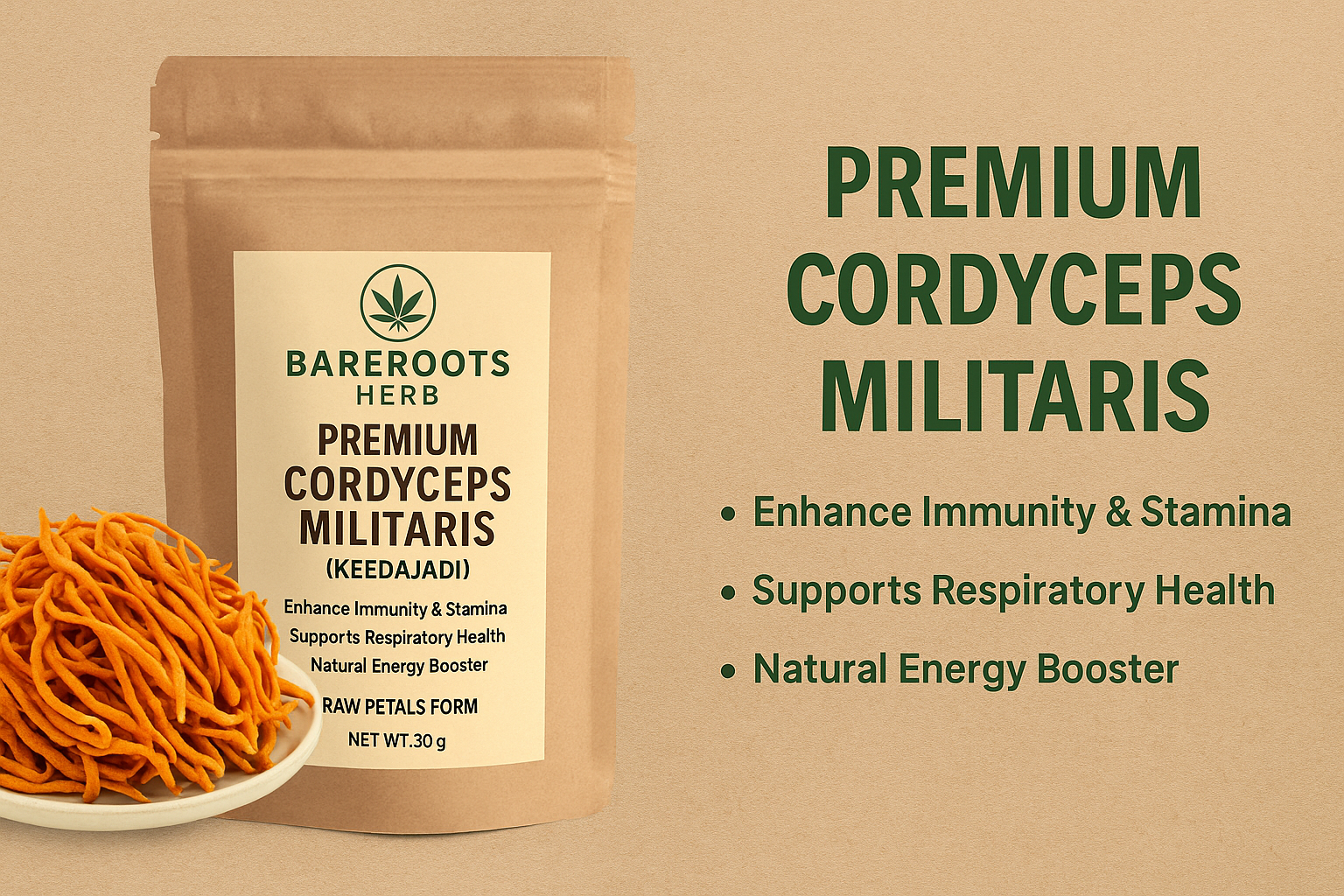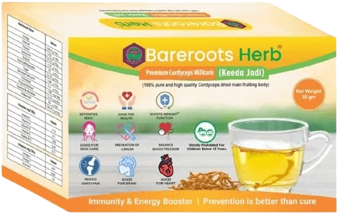 ” Bareroots Herb is an Indian brand specializing in natural health supplements, particularly focusing on medicinal mushrooms like Cordyceps militaris (locally known as Keedajadi). Their offerings include: Premium Cordyceps Militaris (Keedajadi): Available in raw petal form, this product is marketed to enhance immunity and stamina. Keedajadi Cordy-Derma Tea: A blend of Cordyceps and Ganoderma, aimed at supporting weight management, skin health, cholesterol levels, and immune function. These products are available on Amazon India and are manufactured and packed by Bareroots Herb in India. “